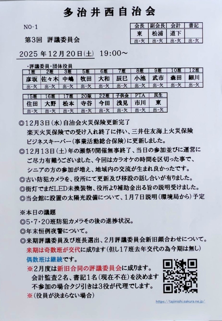 第3回評議員会 2025年5月19日 最終更新日時 : 2025年12月19日 多治井西役員 イベント詳細 日付: 2025年12月20日 19:00 – 20:00 会場: 多治井西自治会館 カテゴリ: 多治井西自治会 タグ: 多治井西自治会, 評議員会 19:00~第3回評議員会を開催します! 内容: ・防犯カメラの設置の進捗について ・自治会館天井に設置の太陽光パネルについて ・年末夜景のスケジュールについて ・年の瀬のお祭りの結果と改善案 当日はよろしくお願いいたします。 FacebookXBlueskyHatenaCopy