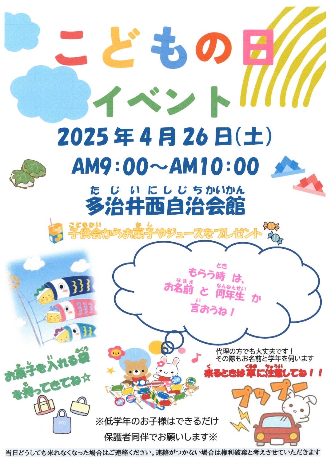 子供会こどもの日 2025年4月22日 最終更新日時 : 2025年4月22日 多治井西役員 イベント詳細 日付: 2025年4月26日 09:00 – 10:00 会場: 多治井西自治会館 カテゴリ: 多治井西自治会, 子供会 タグ: 子供会 4/26(土)AM9:00-10:00に多治井西自治会館にてお菓子とジュースを用意しています! 多治井西の子供会のみなさんは、お菓子を入れる袋を持ってお友達と一緒に来てください!! FacebookXBlueskyHatenaCopy