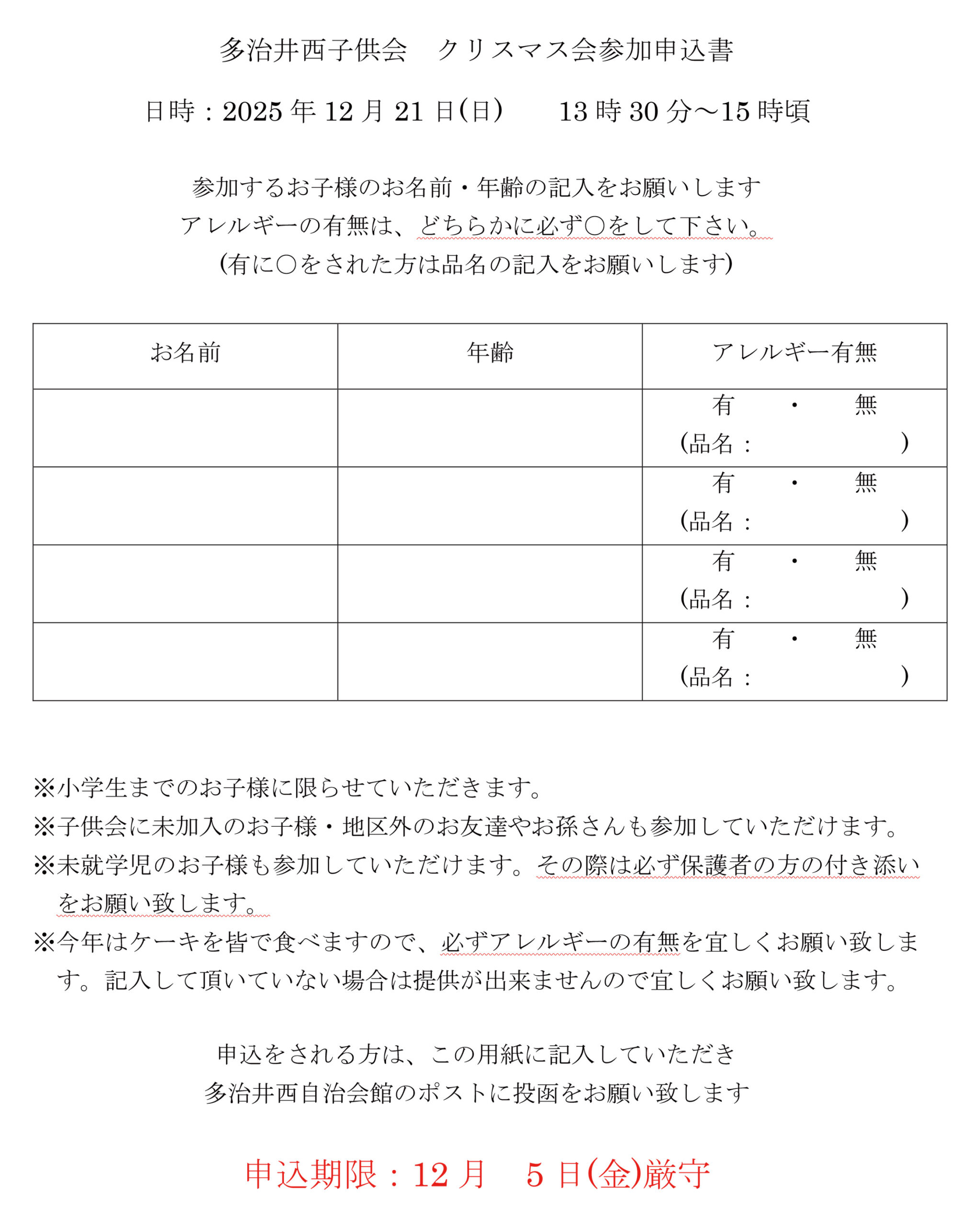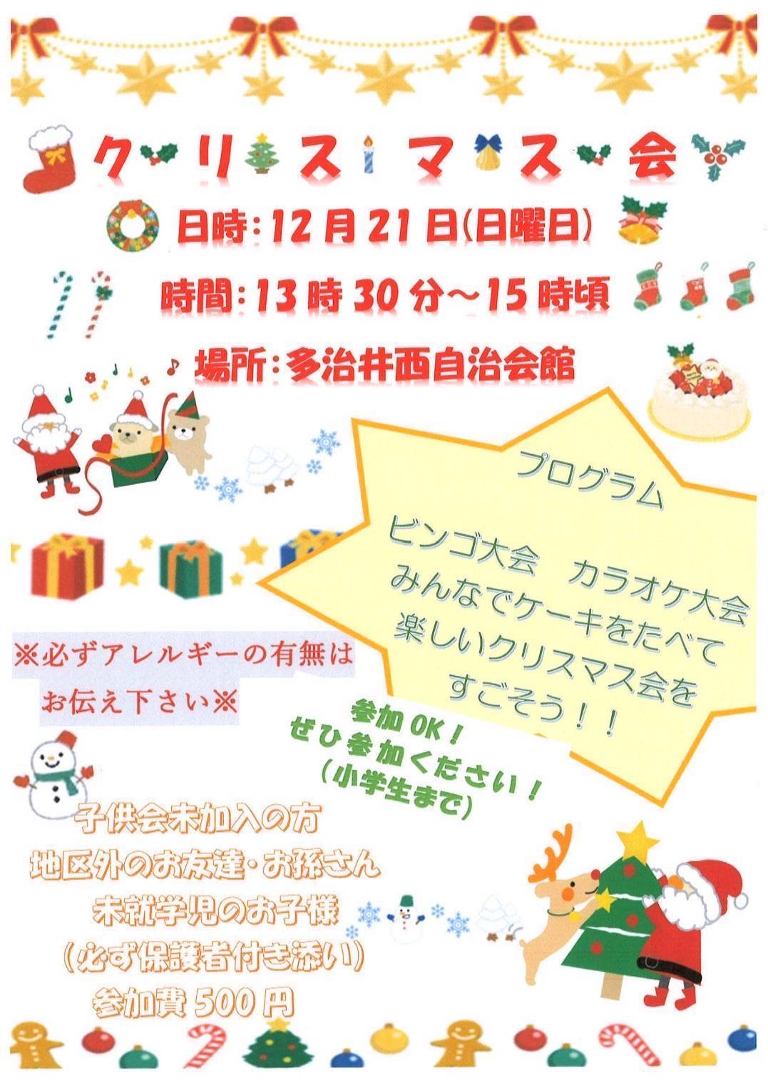 13:30から15:00のあいだ多治井西自治会館にてクリスマス会を開催します。