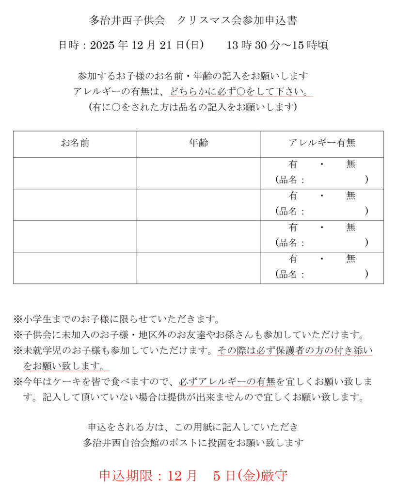 ※今年はケーキを皆で食べますので、必ずアレルギーの有無を宜しくお願い致します。記入して頂いていない場合は提供が出来ませんので宜しくお願い致します。